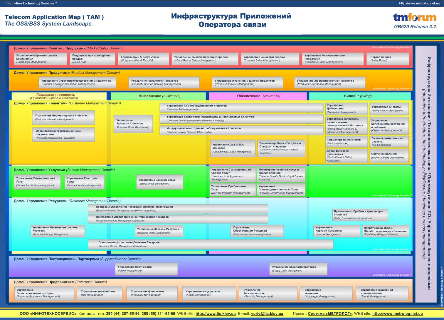 Методология Telecom Application Map (ТАМ) Telecom Application Map (ТАМ) – является составной частью концепции анализа, проектирования и построения систем и программного обеспечения нового поколения - NGOSS (New Generation Operations Systems and Software). Telecom Applications Map (TAM) (инфраструктура прикладных задач оператора связи ) – это иерархия задач прикладных систем OSS/BSS, которая базируется на методологии построения бизнес-процессов eTOM и Корпоративной информационной модели представления данных. TAM представляет собой обобщенную классификацию прикладных информационных систем оператора связи, может служить основой для проектирования и построения эффективной инфраструктуры корпоративной информационной системы компании (множества интегрированных прикладных информационных систем), и является основой для контроля соответствия решений разных поставщиков принципам NGOSS. Схема: Детальная Иерархия задач прикладных систем Telecom Applications Map Система «МЕТРОЛОГ» в иерархии задач прикладных систем Telecom Applications Map (ТАМ) |