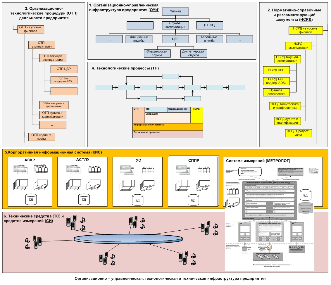 Степень полноты и детализации организационно-технологических процедур определяет уровень эффективности корпоративной системы измерений и Системы Эксплуатации в целом. Уровень 4. Технологические процессы На данном уровне должны быть разработаны, описаны и формализованы технологические процессы измерений, анализа и диагностики различного применения и назначения. Технологические процессы определяют как и в какой последовательности и при каких условиях необходимо проводить измерения, контроль, тестирование, испытания различных параметров, оборудования либо сетей связи. В общем случае, технологические процессы разрабатываются на основе организационно-технологических процедур. Хотя возможны ситуации, когда особенности технологического процесса могут влиять на организационно-технологические процедуры. Степень полноты и детализации технологических процессов также определяют уровень эффективности корпоративной системы измерений и Системы Эксплуатации в целом. Уровень 5. Корпоративные информационные системы (КИС) КИС определяют уровень автоматизации процессов деятельности компании. В общем случае, КИС – это множество взаимосвязанных автоматизированных информационных систем компании различного уровня и назначения, которые должны обеспечивать поддержку технологических процессов компании, и тем самым, обеспечивать исполнение организационно-технологических процедур в среде организационно-управленческой инфраструктуры на основе Нормативно-справочных и регламентирующих документов, и функционирующих на соответствующих технических средствах. Корпоративная система измерений "МЕТРОЛОГ", как составная часть КИС компании, имеет информационные, функциональные, технологические возможности для решения всех задач, связанных с измерениями, анализом и диагностикой телекоммуникационных сооружений, объектов и сетей компании. Уровень 6. Технические и измерительные средства Данный уровень определяет те технические средства (серверы, ПК, сетевое оборудование, принтеры и т.д.), на которых функционируют информационные системы КИС, а также измерительные приборы, оборудование, комплексы, специализированные измерительные системы, которые непосредственно измеряют, контролируют, тестируют различные объекты либо сети. Состояние технических средств определяет эффективность функционирования КИС, а состав и функциональные возможности измерительного оборудования различного применения и назначения определяют, насколько полно и эффективно будут выполняться измерительные операции, поддерживаться технологические процессы тестирования и измерений. Важными функциональными возможностями измерительного оборудования является наличие интерфейсов и протоколов взаимодействия с внешними системами для обеспечения внешнего управления и интеграции конкретного измерительного прибора либо оборудования в систему измерений корпоративного уровня. |